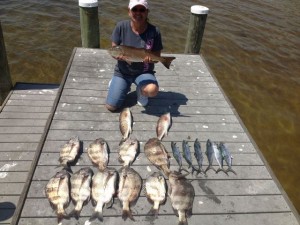 Today I guided Vickie and her Husband on some inshore action in Pensacola bay. The plan was to put 10 or 12 Sheepshead in the box for the fying pan then go and attempt to get a mixed bag of Spanish Mackerel and Redfish. We started the trip pitching baits to a deep water wreck that holds lots of good fish this time of year. Vickie was the first to hook up with a monster 8lb Sheepshead! For a solid hour the action was on fire! After getting our fill of big Pensacola bay sheepshead, we headed to a bank where I have been catching a bunch of spanish every trip. We put two trolling rigs out and starting trolling a deepwater ledge. It didn’t take long before we had the first fish in the box. We quickly boated 5 or 6 fish and then went to the redfish docks. The docks were good today! Most of the fish were between 18 and 25in. We quickly put 3 keepers in the boat and headed in. What a quick and eventful morning!
