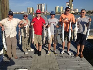 After a wet and miserable boat ride we arrived at our first spot with a live well full of threadfin herring. It didn’t take long before drags started screaming. We had a 6 person limit of king mackerel in an hour of fishing. After filling our coolers we made the decision to come into the bay and catch some redfish. The redfish have been holding close to docks and structure on windy afternoons. For the remainder of the trip we let our clients pull nice slot reds from broken docks. Bull minnows were the bait of choice.