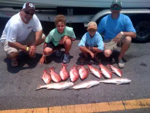 Today I guided Doug, his son, and two friends on a very eventful trip. Doug had specified that he wanted the boys to catch a few redfish. The redfish bite has been very good the last few weeks so I knew that it would be no trouble getting them on a few reds. We started the day trying to catch bait because all of the tackle stores were out this morning. After catching a few bull minnows we headed to the pass to drift some rocks that have been holding good fish. On the very first drop my clients landed a 24″ fish! We broke the ice early. We fished for another 30 minutes landing 6 to 8 perfect slot reds. After we got our limit it was time to snapper fish.